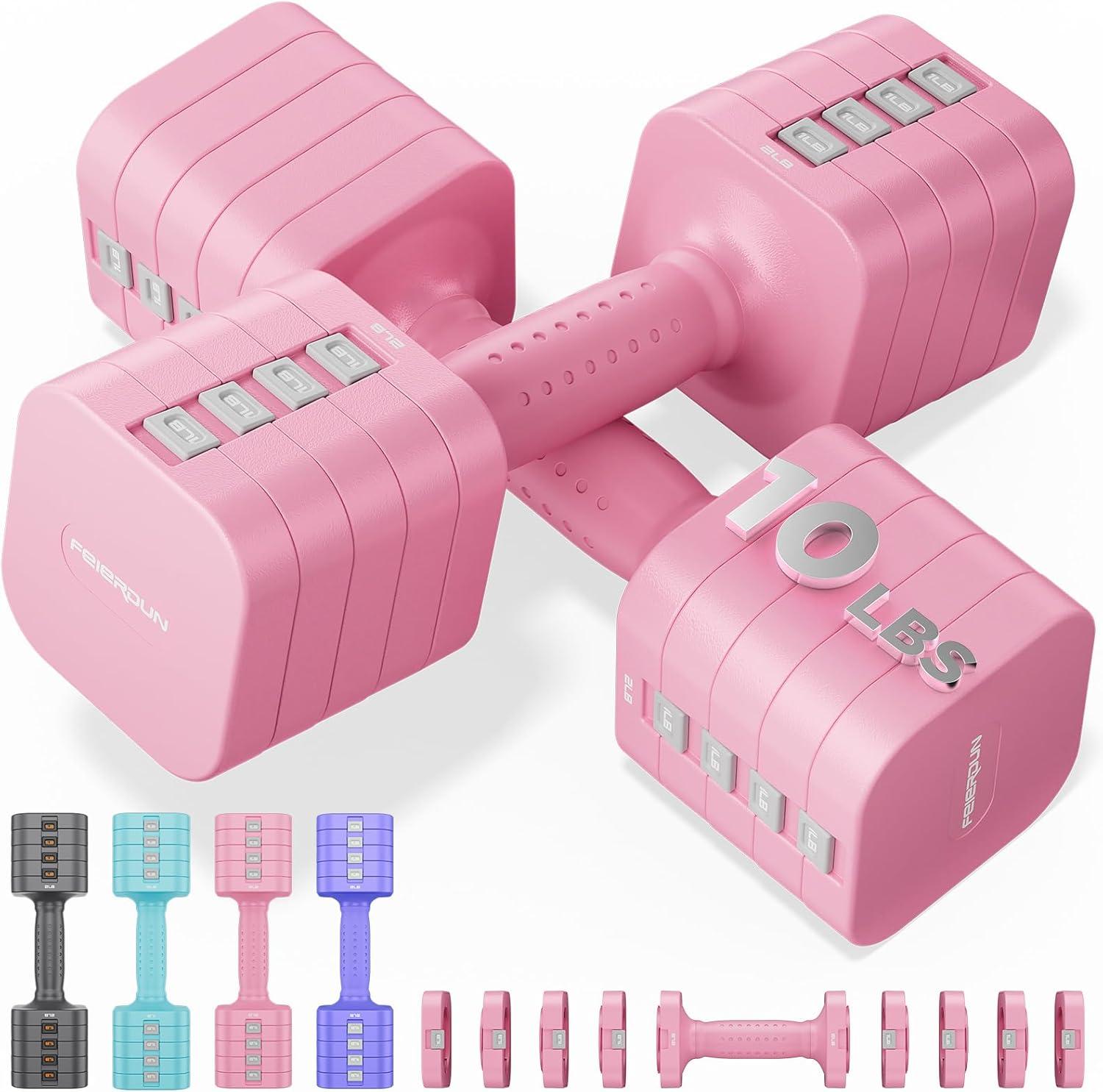 FEIERDUN 5-in-1 Adjustable Dumbbell Set of 2, 12LBS/20LBS Hand Weights for Women, 1s-Adjust Dual-Stable Dumbbell Set for Women Home Gym & Outdoor(B-Cute Pink)